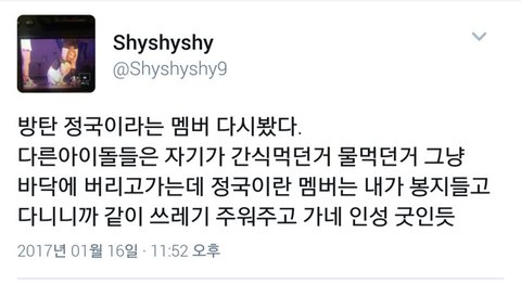 (I have to look at Jungkook of Bangtan in new light. Other idols left trash (food and drink) on the floor but Jungkook come to help me pick up trash since I went around with the garbage bag. His personality seems very nice.)